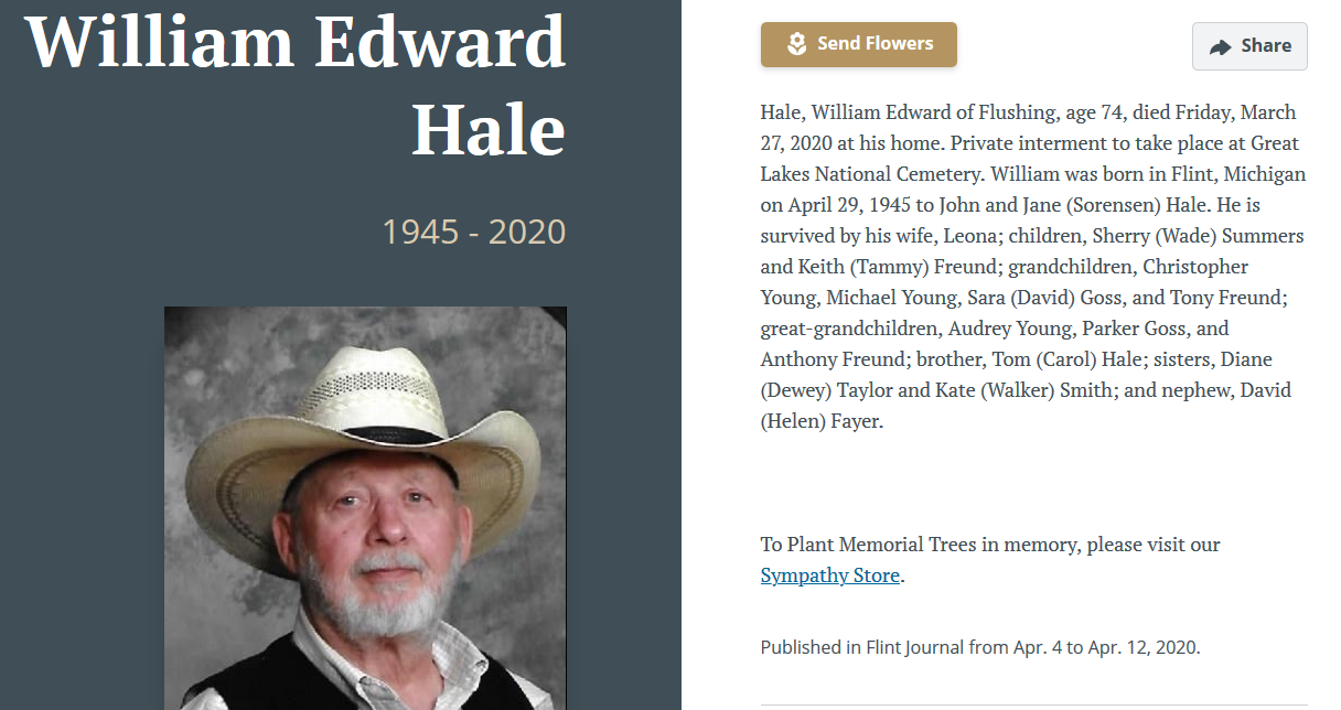 ServicesCremation has taken place and a private Celebration of Life Service will be held at the New Hope Church in Tawas, Michigan. Obituary NoticeWilliam Byron Jones aka “Baldy Bill”, age 78 of Hale, formerly of Owosso, passed away at home under the care of Hospice, with his family by his side, on January 31, 2021. MemorialsMemorial contributions may be made in memory of William to either the Iosco Sportsmen’s Club (P.O. Box 47, East Tawas, Michigan 48730) or the New Hope Church (686 Aulerich Road, East Tawas, Michigan 48730).